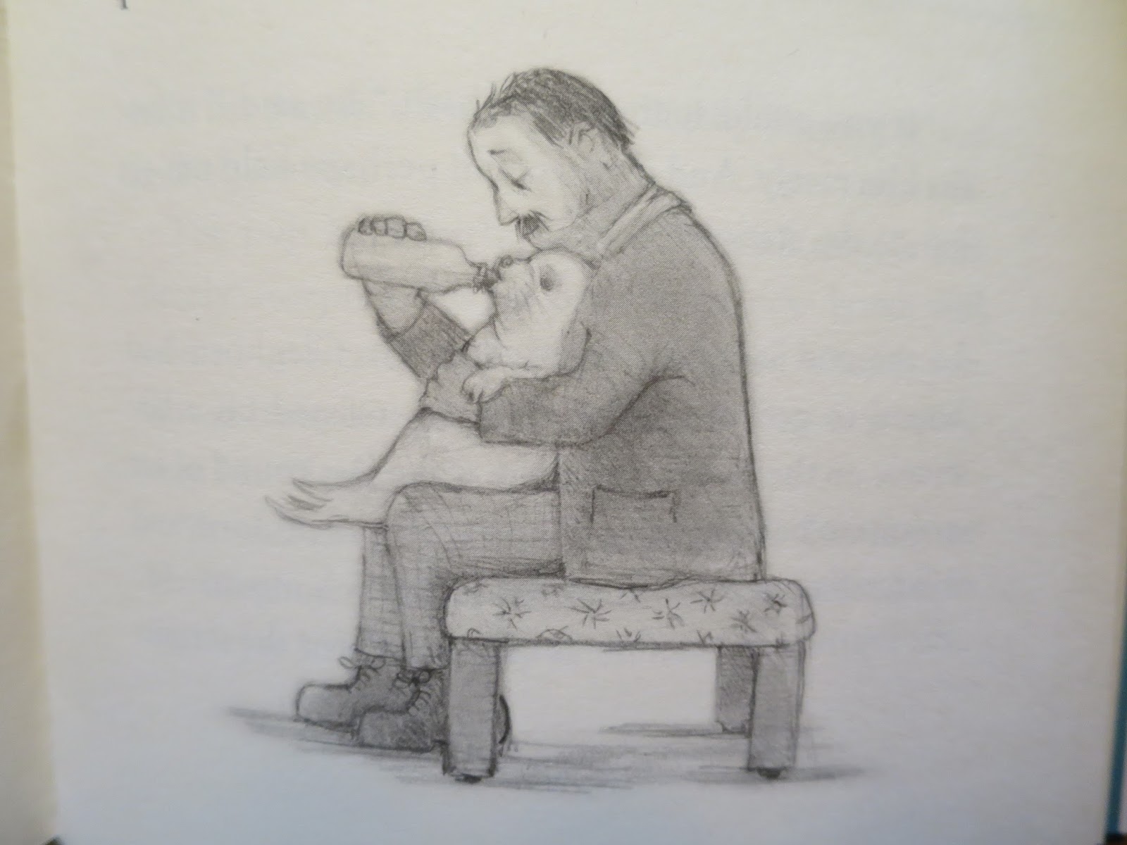 Last year Judith Kerr, now in her nineties, had a very special new book published.  Mister Cleghorn's Seal is a delight.  Handsomely produced on thick cream paper, with gold lettering on the cover, this book is a classy one, and a fun and a moving and a beautiful one.  It isn't a picture book.  It's a story book.  But every spread has wonderful soft pencil drawings to accompany the text.  The stubby nice people who live in this story world along with the big-eyed seal pup are very appealing, and the whole book has the most comfortable feel of a story one smiles one's way through reading.